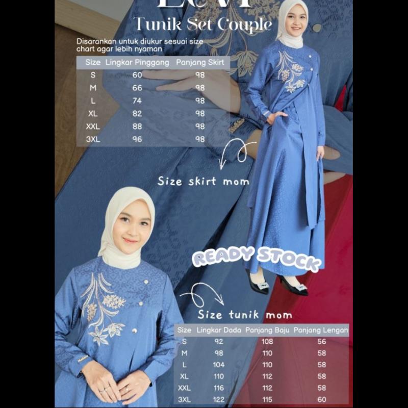 Bismillah... [OPEN PO] Levi Tunik Set Couple by @moikins.kids PRICE LIST ONESET (MOM) S-3XL   Rp. 329.000,- ONESET (LITTLE) 2-4       Rp. 279.000,- 6-12       Rp. 289.000,- MATERIAL Levi Tunik Set Couple by @moikins.kids menggunakan bahan Cotton Dobby, yaitu jenis katun premium dengan tekstur motif timbul yang cantik dan elegan. Bahannya ringan, adem, dan breathable jadi no gerah walaupun dipakai seharian. Cotton dobby juga dikenal nyaman di kulit, tidak mudah menimbulkan bau, serta memiliki daya serap keringat yang baik. Dengan ketebalan yang pas dan jatuh yang rapi, insyaAllah cocok banget untuk outfit Ibu dan Anak tampil stylish tapi tetap nyaman DESAIN Levi Tunik Set Couple hadir memikat dalam warna-warna yang lembut dan elegan, dihiasi bordir floral eksklusif di bagian dada yang memberi sentuhan mewah, dengan potongan A-line yang flowy dan jatuh anggun, serta kancing depan yang busui friendly. dilengkapi desain lengan panjang dengan cutting lurus dan cuff simpel yang rapi di pergelangan, memberikan tampilan manis, sopan, dan tetap nyaman dipakai seharian. dipadukan dengan rok A line yang memberi kesan syar’i, manis, dan nyaman dipakai. sempurna untuk momen spesial ibu dan anak agar tampil serasi, hangat, dan berkelas. COLORS • Patio • Fern • Caspia • Marlin • Cinder SIZE CHART • TUNIK MOM S        LD 92 cm, PB 108 cm, PL 56 cm M       LD 98 cm, PB 110 cm, PL 58 cm L        LD 104 cm, PB 110 cm, PL 58 cm XL      LD 110 cm, PB 112 cm, PL 58 cm XXL   LD 116 cm, PB 112 cm, PL 58 cm 3XL   LD 122 cm, PB 115 cm, PL 60 cm • SKIRT MOM S       LP 60 cm,  PS 98 cm M      LP 66 cm, PS 98 cm L        LP 74 cm,  PS 98 cm XL     LP 82 cm,  PS 98 cm XXL   LP 88 cm,  PS 98 cm 3XL   LP 96 cm, PS 98 cm • TUNIK LITTLE 2       LD 58 cm, PB 52 cm, PL 31 cm 4       LD 66 cm, PB 57 cm, PL 35 cm 6       LD 72 cm, PB 62 cm, PL 40 cm 8       LD 80 cm, PB 68 cm, PL 45 cm 10     LD 85 cm, PB 74 cm, PL 50 cm 12      LD 85 cm, PB 80 cm, PL 54 cm • SKIRT LITTLE 2       LP 40 cm,  PS 54 cm 4      LP 44 cm,  PS 58 cm 6       LP 48 cm, PS 63 cm 8       LP 52 cm,  PS 69 cm 10    LP 56 cm,  PS 79 cm 12      LP 60 cm,  PS 86 cm ESTIMASI BERAT TUNIK SET MOM S  502 gr M 518 gr L 540 gr XL   572 gr XXL 602 gr 3XL 626 gr TUNIK SET LITTLE 2   208 gr 4   230 gr 6   257 gr 8   289 gr 10 334 gr 12  367 gr Toleransi:  • Hasil pencahayaan pada saat pemotretan serta resolusi kamera maupun HP bisa sangat mempengaruhi tampilan foto  • Noda-noda kapur jahit ataupun kotor yang bisa dicuci tidak termasuk rijek karena proses di konveksi  • Ukuran sebenarnya bisa selisih 2-3 cm dari sizechart karena pengaruh produksi massal