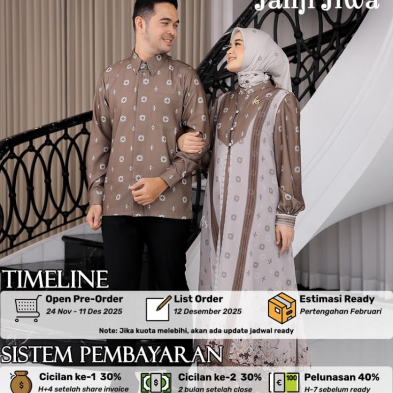 OPEN PO JANJI JIWA COUPLE SERIES By @kamsa_dailypusat Assalamualaikum Hadir kembali koleksi By @kamsa_dailypusat Couple Janji Jiwa Series, yang dirancang dengan nuansa kelembutan dan kesederhanaan yang mendalam. Perpaduan warna yang lembut, dengan sentuhan motif klasik, dan aksen tali pinggang nan anggun, menjadikan koleksi ini sebagai simbol harmoni antara keanggunan dan kenyamanan. Detail motif yang disusun dengan penuh presisi menjadi penanda keindahan yang tidak berlebihan, namun tetap berkelas. In tenderness and harmony. With every step, elegance shines through?~ MATERIAL COUPLE JANJI JIWA Material Torino Printing Exclusive Ciri Khas Torino Printing Exclusive memiliki serat yang halus dan rapat, sehingga tidak menerawang dan nyaman digunakan untuk busana muslimah tidak panas dan adem saat dipakai. Torino Printing Exclusive memiliki warna yang tajam dengan handfeel yang lembut, jatuh dan nyaman. MATERIAL OUTER JANJI JIWA Ciri khas Ceruty Printing Exclusive handfeel lembut dan ringan, sehingga memberikan efek jatuh ketika dipakai. Ciri Khas Khas Torino Printing Exclusive memiliki serat yang halus dan rapat, sehingga tidak menerawang dan nyaman digunakan untuk busana muslimah tidak panas dan adem saat dipakai. Torino Printing Exclusive memiliki warna yang tajam dengan handfeel yang lembut, jatuh dan nyaman. MATERIAL JANJI JIWA SCARF Dengan basic material Printing Scarf Exclusive yang memiliki tekstur halus, lembut dan nyaman dipakai. Janji jiwa Scarf juga mudah untuk dibentuk dan tidak mudah kusut. Perpaduan warna dan motif yang dikemas dengan sempurna membuat Janji Jiwa Scarf wajib mewarnai penampilanmu. DETAIL DRESS JANJI JIWA Material Torino Printing Exclusive Kerah shanghai Resleting di bagian depan (busui friendly) Terdapat tali lepas pasang yang dapat dikreasikan sesuai keinginan Terdapat tag brand di manset kanan Manset 1 kancing dengan lis Motif Printing Exclusive khas @kamsa_daily Terdapat satu kancing di bagian manset (wudhu friendly) Terdapat saku di bagian sisi kanan dress Lingkar rok ±2,5 M Berat dress size L 0,58 kg DETAIL OUTER JANJI JIWA Material Ceruty Printing Exclusive dan Torino Printing Exclusive Outer terpisah dari gamis Kerah Model V-neck dengan kombinasi Torino Printing Exclusive Terdapat tiga kancing pengait Terdapat belah samping kanan kiri dan depan belakang outer Long outer tanpa lengan (sleeveless) Panjang outer mengikuti size dress Berat outer size L 0,3 Kg DETAIL KOKO DEWAS Material Torino Printing Exclusive Menggunakan kerah kemeja Terdapat kancing terbuka di bagian atas dan kancing tertutup Terdapat saku atas Bisa order lengan pendek maupun panjang berkancing Berat koko pendek 0,25 kg (L) DETAIL SCARF JANJI JIWA Material Printing Scarf Exclusive Menggunakan cutting laser Tersedia Ukuran 120 cm x 120 cm Tersedia scarf Only, berat scarf 0.08 kg JANJI JIWA hadir dengan 5 pilihan warna yang menawan : Rose Maroon Misty Grey Denim Blue Brown Beige Ash Choco DETAIL SIZE DRESS JANJI JIWA Lingkar Dada / Panjang Badan / Lingkar Ketiak / Panjang Lengan XS - LD 92 / PB 128 / LK 38 / PL 56 S - LD 96 / PB 130 / LK 39 / PL 56 M - LD 100 / PB 135 / LK 42 / PL 57 L - LD 104 / PB 140 / LK 43 / PL 58 XL - LD 110 / PB 142 / LK 44 / PL 58 XXL - LD 120 / PB 142 / LK 46 / PL 60 *(20k)* XXXL - LD 132 / PB 142 / LK 48 / PL 60 *(50k)* DETAIL SIZE KOKO JANJI JIWA Lingkar Dada / Panjang Badan / Panjang Lengan Pendek / Panjang Lengan Panjang S - LD 104 / PB 73 / PLpd 25 / PLpj 56 M - LD 108 / PB 73 / PLpd 25 / PLpj 57 L - LD 112 / PB 74 / PLpd 27 / PLpj 58 XL - LD 116 / PB 76 / PLpd 27 / PLpj 58 XXL - LD 120 / PB 76 / PLpd 29 / PLpj 60 XXXL - LD 128 / PB 76 / PLpd 29 / PLpj 60 So, segera amankan warna favoritmu dan Jangan sampai terlewatkan ya…