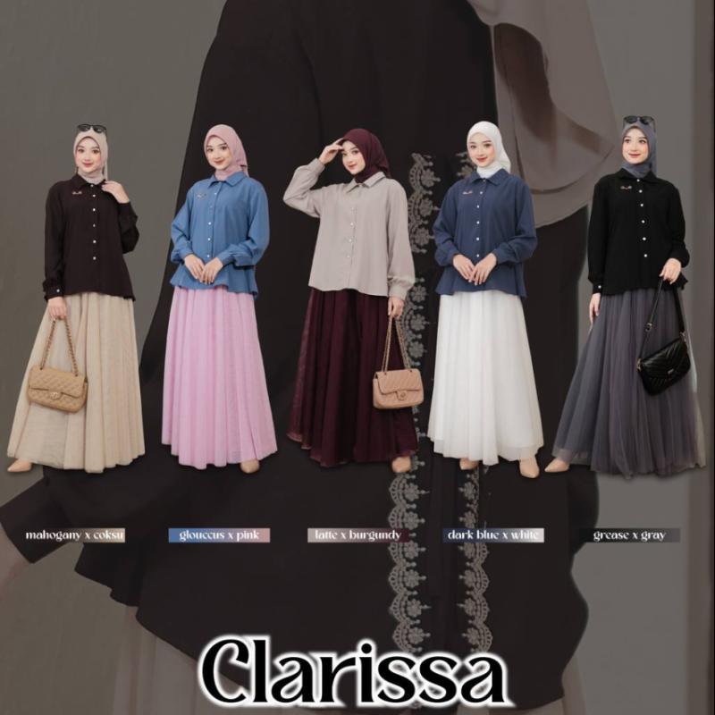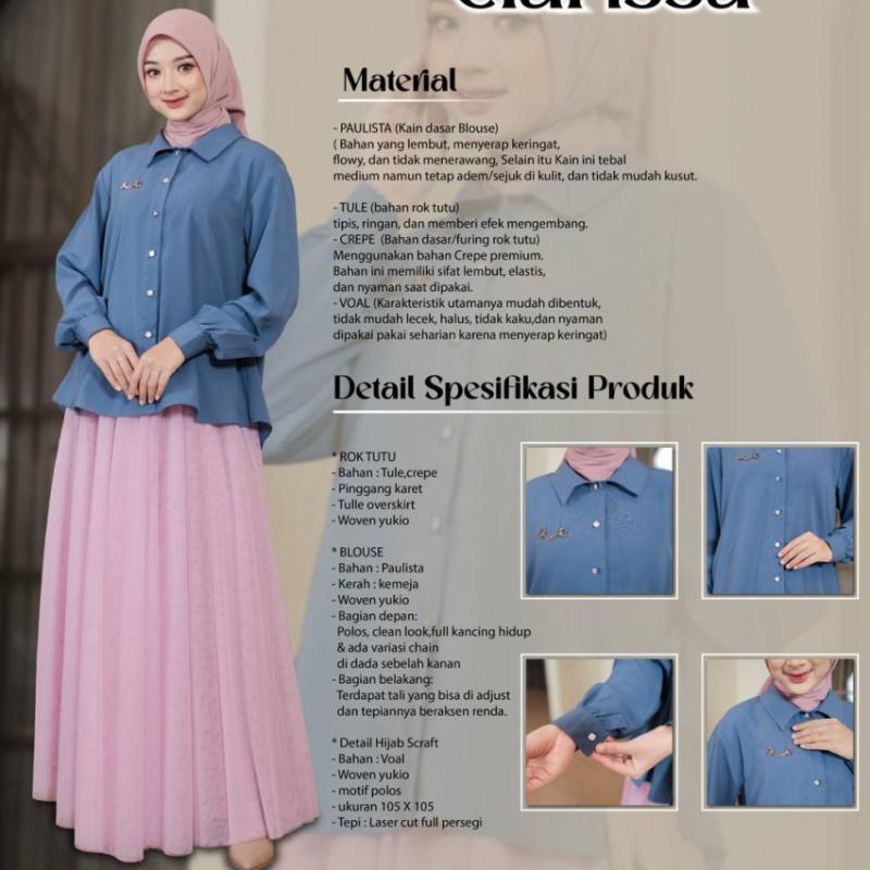 Bismillahirrohmanirrohim…. *KATALOG ONE SET CLARISSA BY YUKIO* *Open Pre Order 10-20 APRIL 2026* *MATERIAL PRODUK*: - *PAULISTA* (Kain dasar Blouse) ( Bahan yang lembut, menyerap keringat, flowy, dan tidak menerawang, Selain itu Kain ini tebal medium namun tetap adem/sejuk di kulit, dan tidak mudah kusut.) - *TULE* (bahan rok tutu) tipis, ringan, dan memberi efek mengembang. - *CREPE* (Bahan dasar/furing rok tutu) Menggunakan bahan Crepe premium. Bahan ini memiliki sifat lembut, elastis, dan nyaman saat dipakai. - *VOAL* (Karakteristik utamanya mudah dibentuk, tidak mudah lecek, halus, tidak kaku,dan nyaman dipakai pakai seharian karena menyerap keringat) *SPESIFIKASI PRODUK* Detail Rok Tutu - Bahan : Tule,crepe - ?Pinggang karet - ?Tulle overskirt - ?Woven yukio Blouse - Bahan : Paulista - Kerah : kemeja - ?Woven yukio - Bagian depan: Polos, clean look, full kancing hidup & ada variasi chain di dada sebelah kanan - Bagian belakang: Terdapat tali yang bisa di adjust dan tepiannya beraksen renda. Detail Hijab Voal - Bahan : Voal - ?Woven yukio - ?motif polos - ukuran 105 X 105 - ?Tepi : Laser cut full persegi *PILIHAN WARNA :* 1. Grease x gray 2. ?Glouccus x pink 3. ?Dark blue x white 4. ?Mahogany x Coksu 5. ?Latte x Burgundy PRICELIST, SIZE CHART, BERAT PRODUK, TIMELINE Dapat kalian lihat di akun kami ig:Katalog_yukio_pusat #Clarissa#Oneset#blouse#roktutu#ootd#fashion#yukiopusat