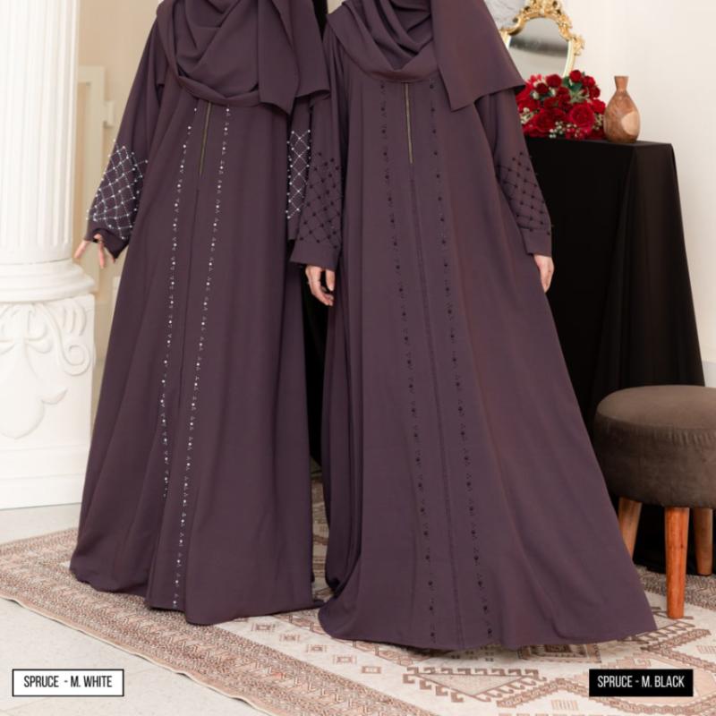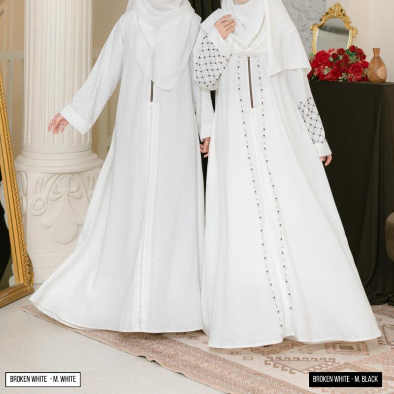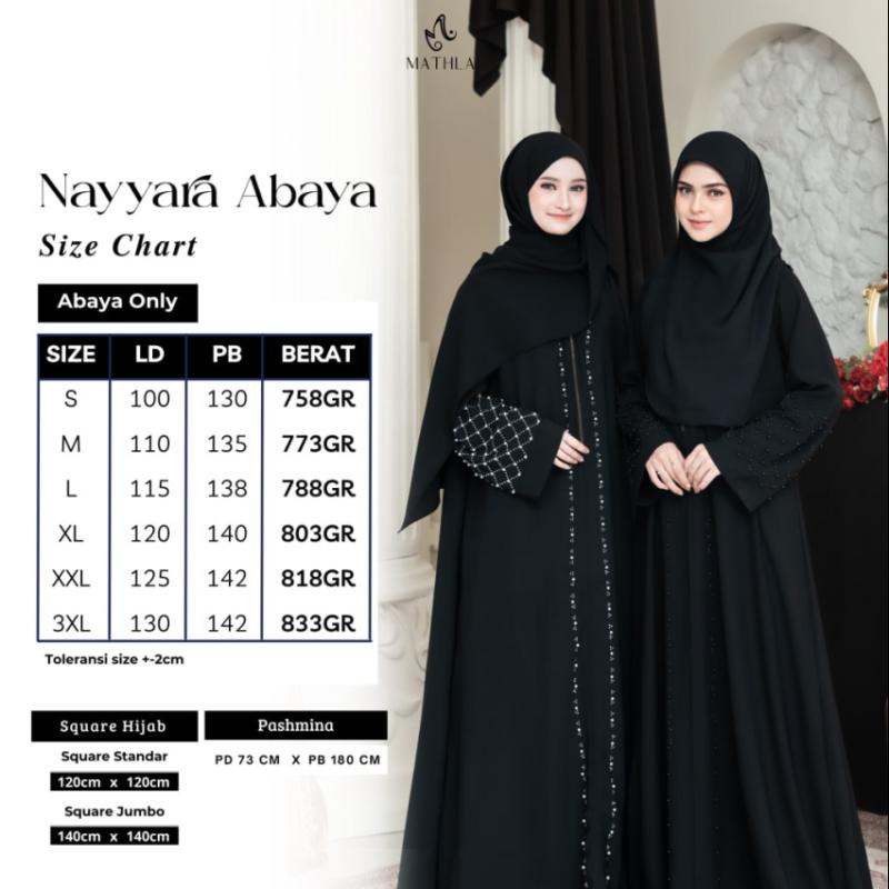 Bismillahirrahamannirrahim.. OPEN ORDER NAYYARA ABAYA Batch 3 by MATHLA • 5 warna cantik masing masing terdapat 2 pilihan mutiara (black dan white) BLACK MAROON MAHOGANY SPRUCE BROKEN WHITE Spesifikasi: Nayyara Abaya Series menggunakan bahan Sabrina ( Lembut, jatuh, adem, nyaman digunakan) * Abaya menggunakan resleting besi premium tebal * ?Cutting lebih besar dari size standar karena abaya tapi tetep menyesuaikan tubuh masing-masing * ?Terdapat payet dan mutiara cantik di beberapa bagian Abaya * ?Lengan loose * Saku samping Pashmina menggunakan bahan yang sama yaitu bahan Sabrina Square oval menggunakan polly catton . . Notes : - Perbedaan size +-2cm karena cutting massal - ?Perbededaan warna bisa terjadi karena perbedaan cahaya - Khusus warna BW wajib memakai daleman karena sedikit menerawang Keterangan size, harga ada di foto ya Dear