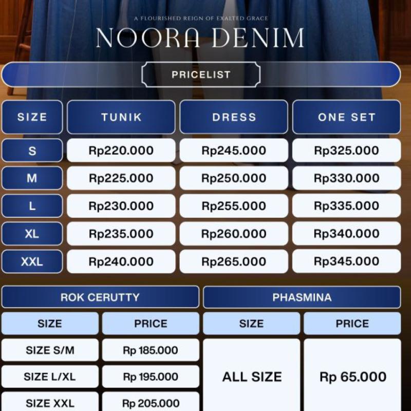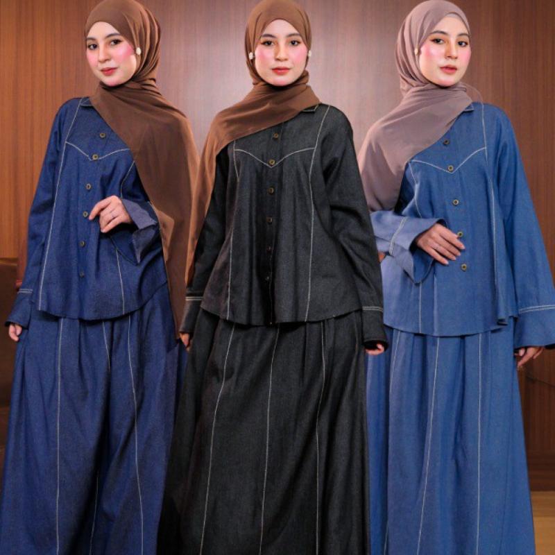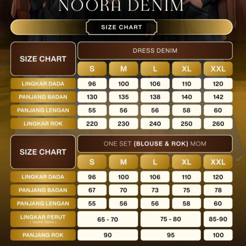 NOORA DENIM Open Pre Order : 26 Januari - 16 Februari 2026 _*“First time always leaves a mark”*_ Untuk pertama kalinya, ANB memperkenalkan Denim Series— bukan hanya sekadar denim, tapi cerita tentang berani melangkah ke hal baru Denim Series First Time lahir dari keinginan untuk menghadirkan artikel yang lebih exclusive. Cocok dipakai harian, cocok untuk formal dan non formal, dan tetap terasa nyaman tanpa harus berlebihan. Cuttingan yang exclusive , material yang lembut namun tetap kokoh menjadikan Denim Series ini sebagai *First Exclusive series ANB di 2026 ini* So you must have DESKRIPSI PRODUK DRESS : ~ Menggunakan material loewe denim premium ~ Menggunakan full kancing hidup ~ Cutting dress lose abaya reguler fit ~ Terdapat saku tempel depan kanan dan kiri ~ Terdapat aksen benang timbul yang membuat look makin exclusive ~ Manset tangan kancing satu dengan aksen benang timbul TUNIK : ~ Menggunakan material loewe denim premium ~ Menggunakan full kancing hidup ~ Menggunakan kerah kemeja casual ~ Terdapat aksen benang timbul yang membuat look semakin exclusive ~ Tunik dengan aksen belah samping bagian rok kanan dan kiri ~ Pola cutting yang exclusive ~ Manset tangan kancing satu dengan aksen benang timbul ONE SET : ~ Menggunakan material loewe denim premium ~ Menggunakan full kancing hidup ~ Menggunakan kerah kemeja casual ~ Cutting blouse reguler fit ~ Manset tangan kancing satu dengan pola cutting trumpet sleeve ~ Rok dengan cutting standar A line dan aksen benang timbul vertikal membuat efek jenjang ~ Terdapat saku samping kanan di bagian rok ~ Rok menggunakan karet dibagian lingkar belakang yang adjustable ROK CERUTTY : ~ Menggunakan material double layer cerutty babydoll ~ Full karet dibagian pinggang yang adjustable ~ Cutting rok semi klok ~ Available 2 warna ( Mauve & Choco ) PHASMINA : ~ Menggunakan material double layer cerutty babydoll ~ Ukuran phasmina All size 180cm x 73 cm ~ Menggunakan lilit jahit tepi ~ Available 2 warna ( Mauve & Choco ) Availabe 5 size : S/M/L/XL/XXL ( Dress Tunik Blouse ) Available 3 size : S-M / L-XL / XXL ( Rok denim & Cerutty ) Availabe 3 warna : Black ?Navy Blue Pricelist : Tabel terpisah First time always matters Dan temukan cerita Denim Series bersama ANB