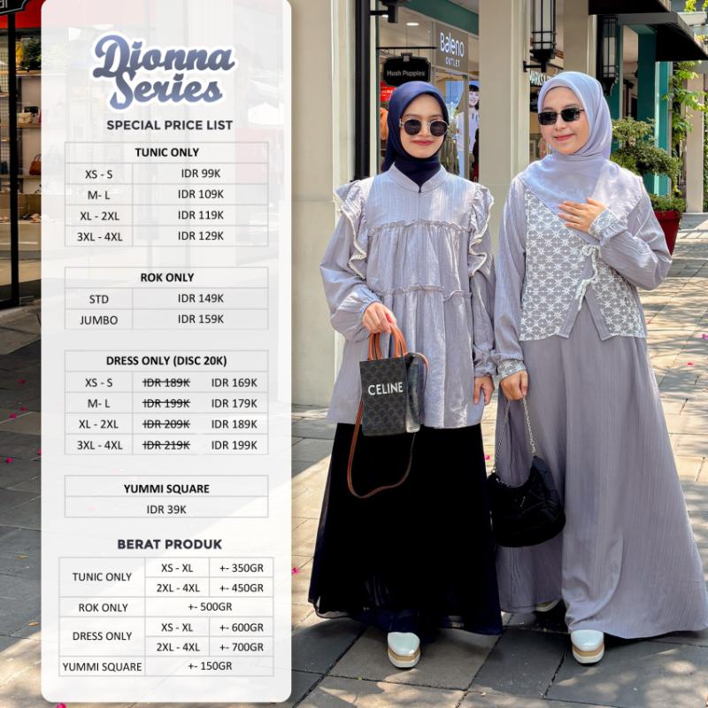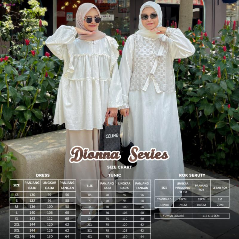 *Dionna Series* Hadir dengan desain yang cantik, cute, simple, siap jadi teman ternyaman kamu Hadir dengan 2 pilihan style Dress & Tunic yang chic, desain kekinian & harga super hemat mulai dari 99k aja *Pilihan Warna Dress* •Brown (Yummi square Milo) •Black (Yummi square Black) •Cream (Yummi square Cream) •Soft Grey (Yummi square Soft Grey) •BW (Yummi square BW) *Pilihan Warna Tunik* •Brown (Yummi & Rok Black) •Black (Yummi & Rok Grey) •Cream (Yummi & Rok Milo) •Soft Grey (Yummi & Rok Navy) •BW (Yummi & Rok Cream) *Timeline PO* Open PO 15 - 22 April Max Transfer : 50% 23 April 50% 30 Mei Estimasi Ready : Akhir Mei *Spesifikasi Dress* ~ Material Baby Crush mix Brokat yang menempel dengan detail pita yang super cantik ~ Kerah shanghai ~ Resleting depan (busui friendly) ~ Manset tangan kancing satu dengan list brokat yang cantik ~ Saku kanan ~ Terdapat tali kecil dibagian samping kiri & kanan yang bisa di ikat cantik ~ Lebar bawah 2,5 - 2,8m ~ Berat Produk +/- 600gr *Spesifikasi Tunik* ~ Material Baby Crush ~ Kerah Shanghai ~ Resleting depan (busui friendly) ~ Terdapat detail kriwil cantik di bagian depan & belakang sehingga menjadikan tunik jadi lebih manis ~ Terdapat kriwil melingkar dibagian bahu dengan list renda yang super cantik ~ Manset tangan karet super nyaman *Spesifikasi Rok* ~ Material Seruty Babydoll Premium ~ Detail rampel kecil di pinggang super cantik & elegant ~ Full furing hyget super lembut ~ Bagian pinggang full karet super nyaman & flexible anti pengap *Spesifikasi Yummi Square* ~ Matt : Fine (lembut, mudah dibentuk, ringan) ~ Tepi dijahit rapih ~ All size +/- 115cm x 115cm ~ Berat Produk 150gr *Price List Dress Only (Disc 20k)* XS-S ~IDR 189k~ jadi IDR 169k M-L ~IDR 199k~ jadi IDR 179k XL-2XL ~IDR 209k~ jadi 189k 3XL-4XL ~IDR 219k~ jadi 199k *Price List Tunik Only* XS - S IDR 99k M - L IDR 109k XL - 2XL IDR 119k 3XL - 4XL IDR 129k *Price List Rok Only* Sandart IDR 149k Jumbo IDR 159k Yummi Square IDR 39k