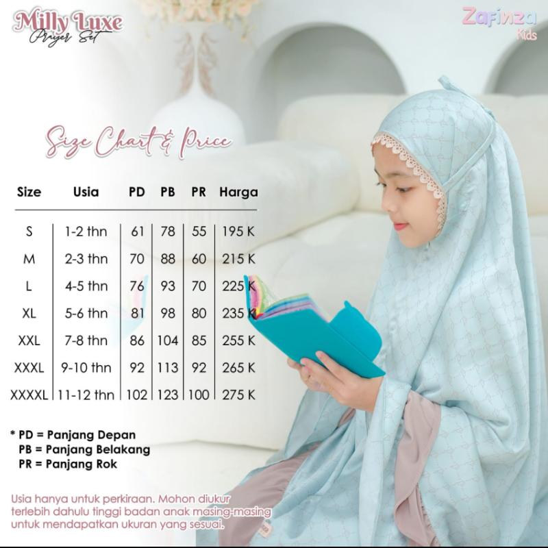 Bismillah MasyaAllah Open PO Milly Luxe Mom & Kids Milly Luxe menggunakan perpaduan 2 jenis kain yaitu kain motif dari bahan leona armany Silk dan kain polos dg bahan jersey import korea khan zafinza yg MasyaAllah kainnya adem, empuk, lembut dan halus. Jadi nyaman bgt dipakai buat sholat Milly Chic Pattern terdiri dari 6 warna 1. White Signature 2. Mint 3. Pinkblush 4. Sage green 5. ivory 6. babypink Size Chart dan Harga Milly Crincle S (1-2 thn) : PD 61 / PB 78 / PR 55 / 195 k M (2-3 thn) : PD 70 / PB 88 / PR 60 / 215 k L (4-5 thn) : PD 76 / PB 93 / PR 70 / 225 k XL (5-6 thn) : PD 81 / PB 98 / PR 80 / 235 k XXL (7-8 thn) : PD 86 / PB 104 / PR 85 / 255 k XXXL (9 -10thn) : PD 92 / PB 113 / PR 92 / 265 k XXXXL (11- 12 thn) : PD 102 / PB 123 / PR 100 / 275 k Size Chart dan Harga Milly Crincle Mom PD : 120 PB : 146 PR : 105 All size Harga 295 k