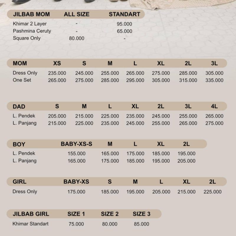 "Serafina Sarimbit 2025" Batch 2 Product Knowladge/Informasi produk Matterial Menggunakan anti uv lumera yang lembut dan mempunyai handfeel yang rapat dan halus dengan look flowly saat dipakai dan sangat nyaman anyep dan antep Design Dress Design dress menggunakan kerah shanghai dengan kancing depan busui, opnaisel pada dada dan list yang terlihat sangat elegant Free oby yang bisa dilepas pasang Design Tunik Design tunik menggunakan kerah shanghai dengan kancing depan dengan opnaisel pada dada dan list yang terlihat sangat elegant Design Khimar Khimar dua layer softpad (foto artikel saat sarimbit) Design Rok Rok motif dengan karet pada pinggang *Design Girl sama dengan Gamis Mom* *Koko dad dan boy* Menggunakan bahan *peach shofie* (seperti pada puspa raya) dengan detail motif ethnik dan saku pada dada *NOTE : ADA PERBEDAAN WARNA SATU USAP UNTUK MOM DAN DAD KARENA PERBEDAAN BAHAN Colour/warna Terdapat 4 warna yang cocok untuk aktivitas apapun : Mossgreen Almond Cyan Lava Pricelist Sesuai pricelist Time line Sesuai fliyer Estimasi berat Gamis : 0,6-0,65 Top skirt : 0,65-0,7 Pashmina : 0,2 Square jumbo : 0,25 Koko dad : 0,3 Koko boy : 0,2 Disclaimer : Jahitan kemungkinan akan ada selisih 1-3cm karena produksi massal mohon diikhlaskan Untuk warna pada foto bisa jadi ada perbedaan 10-20% karena pencahayaan dan proses editing, kami akan memberikan beberapa referensi untuk mendapatkan warna paling mendekati Don't miss it dear order klik link sematan yaaaa