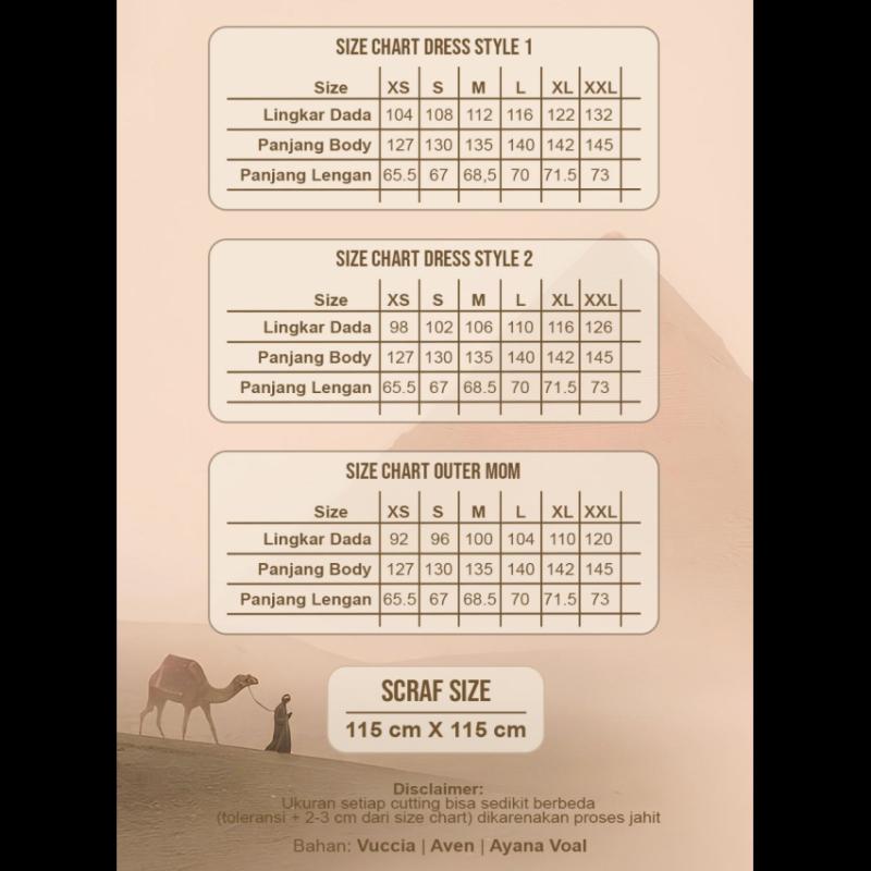 MIDDLE EAST by ADEN SIGNATURE (Open Pre-Order: 10 - 27 APRIL 2026) Di antara hamparan gurun dan langit yang tak pernah benar-benar gelap, lahir sebuah peradaban… Bukan sekadar tempat, “Middle East” adalah jejak waktu. Tentang kota-kota kuno yang tetap hidup, tentang lorong sejarah yang menyimpan keindahan, ilmu, seni, dan keyakinan yang terus diwariskan lintas generasi. Kini, kisah itu kami hadirkan kembali. Dalam bentuk yang lebih dekat, lebih hidup… dan tetap bermakna. Koleksi terbaru kami terinspirasi dari keindahan budaya dan arsitektur Timur Tengah — menggabungkan sentuhan klasik dengan interpretasi modern, untuk perempuan yang ingin tampil anggun, berkelas, dan penuh cerita. Karena setiap detailnya bukan hanya tentang pakaian, tapi tentang warisan yang dikenakan. MATERIAL PRODUK – MIDDLE EAST Vuccia (Dress) ? Kain yang halus, lembut, ringan, dan adem di kulit. Memiliki karakter flowy yang cantik saat dikenakan, memberikan kesan anggun dan nyaman untuk aktivitas seharian. Aven (Outer) ? Kain yang halus dan lembut dengan tekstur ringan. Memiliki karakter tipis dan sedikit menerawang, menciptakan tampilan layering yang elegan dan berkelas. Ayana Voal (Scarf) ? Kain yang halus, lembut, dan ringan. Nyaman digunakan serta mudah dibentuk, sehingga menghasilkan tampilan yang rapi dan effortless. SPESIFIKASI PRODUK – MIDDLE EAST STYLE 1 Dress dengan siluet anggun yang memadukan sentuhan klasik dan modern, menghadirkan tampilan yang elegan dan berkelas dalam setiap detailnya. * Menggunakan kerah shanghai yang memberikan kesan rapi dan sophisticated * Bukaan resleting di bagian depan, praktis dan tetap seamless saat dikenakan (busui friendly) * Detail variasi plisket di bagian depan dress, menambah dimensi dan kesan flowy yang cantik * Lengan panjang dengan desain lengan setali, memberikan tampilan yang lebih refined * Manset dengan bukaan kancing untuk sentuhan detail yang manis (wudhu friendly) * Dilengkapi metal tag Aa di bagian manset sebagai signature detail STYLE 2 Dress dengan siluet anggun yang diperkaya detail klasik bernuansa Timur Tengah. Memiliki siluet yang flowy dengan detail kerut dan lipit yang memberikan efek lebih hidup saat dikenakan. * Menggunakan kerah shanghai memberikan kesan rapi dan sophisticated * Detail variasi kerut di bawah kerah, menciptakan dimensi yang manis dan mempercantik area atas dress * Bukaan resleting di bagian depan, praktis dan tetap nyaman digunakan (busui friendly) * Lengan raglan dengan variasi lipit di bagian tengah lengan, memberikan tampilan yang unik dan berkarakter * Manset dengan bukaan kancing sebagai detail elegan (wudhu friendly) * Terdapat saku di sisi kanan dress, menambah fungsi tanpa mengurangi estetika * Dilengkapi metal tag Aa di bagian manset sebagai signature detail OUTER ONLY Outer jatuh ringan dan flowy, memberikan efek layering yang cantik tanpa terasa berat. * Menggunakan kerah lapel (krah jas) yang memberikan kesan rapi dan sophisticated * Dilengkapi tali serut di bagian pinggang, sehingga bisa disesuaikan untuk menciptakan siluet yang lebih fit atau loose sesuai style * Lengan raglan dengan detail kerut di bagian ujung, memberikan sentuhan manis dan feminin * Manset dengan aksen kerut yang dilengkapi metal tag Aa sebagai signature detail DETAIL SCARF - Bahan: Ayana Voal — halus, ringan & nyaman dipakai - Motif: Original pattern by ADEN SIGNATURE - Tepi: Laser cut rapi - Ukuran: 115 x 115 cm (Scarf Standar) - Packaging: - Scarf Only ? Hard box eksklusif - Set Scarf ? Goodiebag ADEN SIGNATURE (menyatu dengan dress) DETAIL UMUM – MIDDLE EAST Available Colors Ash Black Cream Mauve White Item Tersedia * Style 1 * Style 2 * Outer * Scarf * Set Style 1 + Scarf * Set Style 2 + Scarf * Set Style 2 + Outer * Set Style 2 + Outer + Scarf Size Chart : XS - XXL Tersedia di @aden_katalog_signature Packaging * Goodiebag — untuk seluruh pembelian dress (termasuk set dengan scarf) * Hard Box — khusus pembelian scarf #middleeastdress #middleeastbyaden