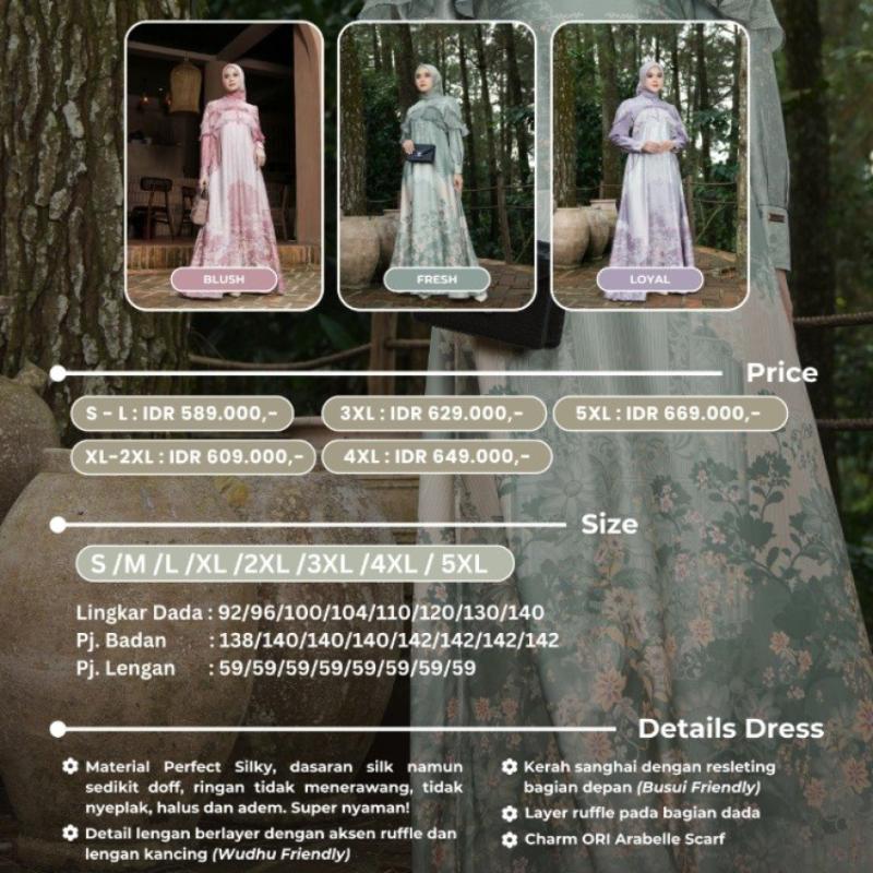 Bismillahirrahmanirrahim.. ___ PRE - ORDER LUSH GARDEN SERIES ( Dress dan Scarf ) Lush Garden Series Lush Garden Series menghadirkan keindahan yang hidup dan bertumbuh terinspirasi dari taman yang rimbun dan penuh warna. Dengan detail motif yang kaya dan siluet yang mengalir, setiap rancangan mencerminkan harmoni antara kelembutan dan kekuatan. Karena seperti taman yang terus berkembang, pesona perempuan sejati selalu menemukan caranya untuk bersinar. Detail Lush Garden Dress Material Perfect Silky, dasaran silk namun sedikit doff, ringan tidak menerawang, tidak nyeplak, halus dan adem. Super nyaman! Layer ruffle pada bagian dada Kerah sanghai dengan resleting bagian depan (Busui Friendly) Detail lengan berlayer dengan aksen ruffle dan lengan kancing (Wudhu Friendly) Charm ORI Arabelle Scarf Detail Lush Garden Scarf Bahan Signature Voal by Arabelle Mudah dibentuk, tegap di dahi Ironless Dilengkapi box exclusive by Arabelle Scarf Detail Size Chart Lush Garden Dress ( S - 5XL ): LD : 92/96/100/104/110/120/130/140 Pj. Badan : 138/140/140/140/142/142/142/142 Pj. Lengan : 59/59/59/59/59/59/59/59 Detail Lush Garden Scarf: Size : 115 cm X 115 cm ___ Detail Harga Lush Garden Series: Lush Garden Dress: IDR 589.000,- ( S - L ) IDR 609.000,- ( XL - 2XL ) IDR 629.000,- ( 3XL ) IDR 649.000,- ( 4XL ) IDR 669.000,- ( 5XL ) Lush Garden Scarf : IDR 149.000,- ___________ BUNDLING PRICE LUSH GARDEN DRESS + SCARF ( S - L ) NORMAL PRICE : IDR 738.000,- SPECIAL PRICE : IDR 718.000,- ( XL - 2XL ) NORMAL PRICE : IDR 758.000,- SPECIAL PRICE : IDR 738.000,- ( 3XL ) NORMAL PRICE : IDR 778.000,- SPECIAL PRICE : IDR 758.000,- ( 4XL ) NORMAL PRICE : IDR 798.000,- SPECIAL PRICE : IDR 778.000,- ( 5XL ) NORMAL PRICE : IDR 818.000,- SPECIAL PRICE : IDR 798.000,- Available Colour : * Fresh * Loyal * Blush Nb : Request potong dikenakan biaya tambahan Rp. 20.000,- OPEN OPEN PRE - ORDER MULAI SENIN, 13 APRIL 2026 s/d SABTU, 18 APRIL 2026 dengan ESTIMASI 18 MEI 2026