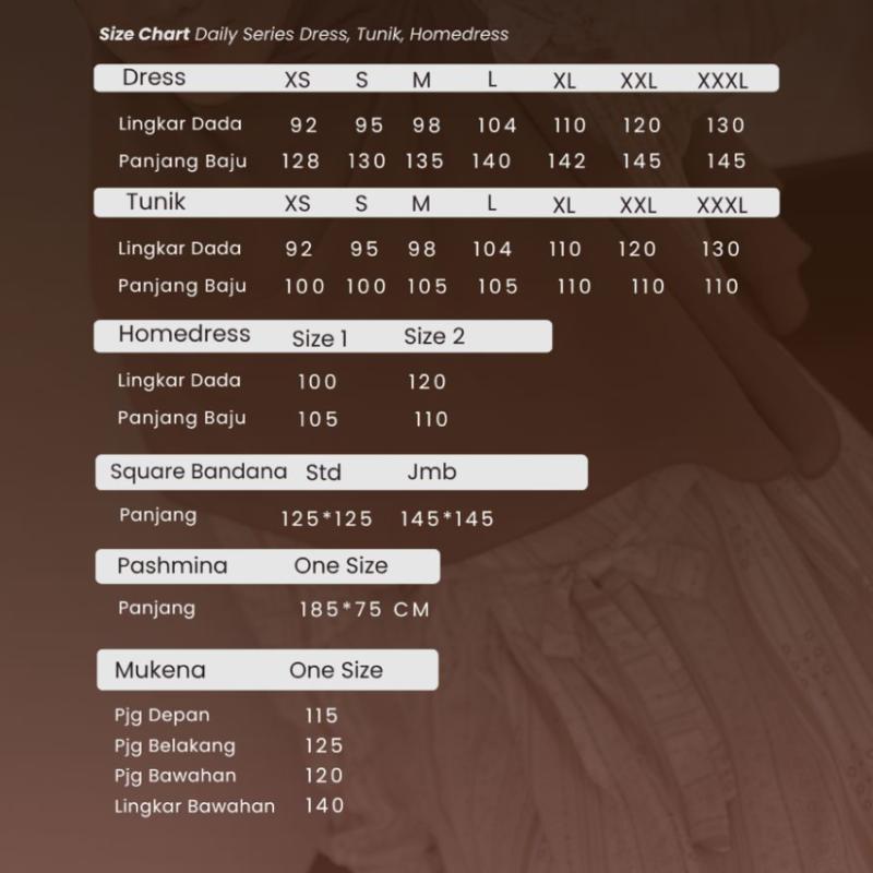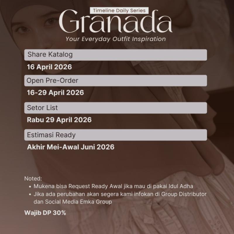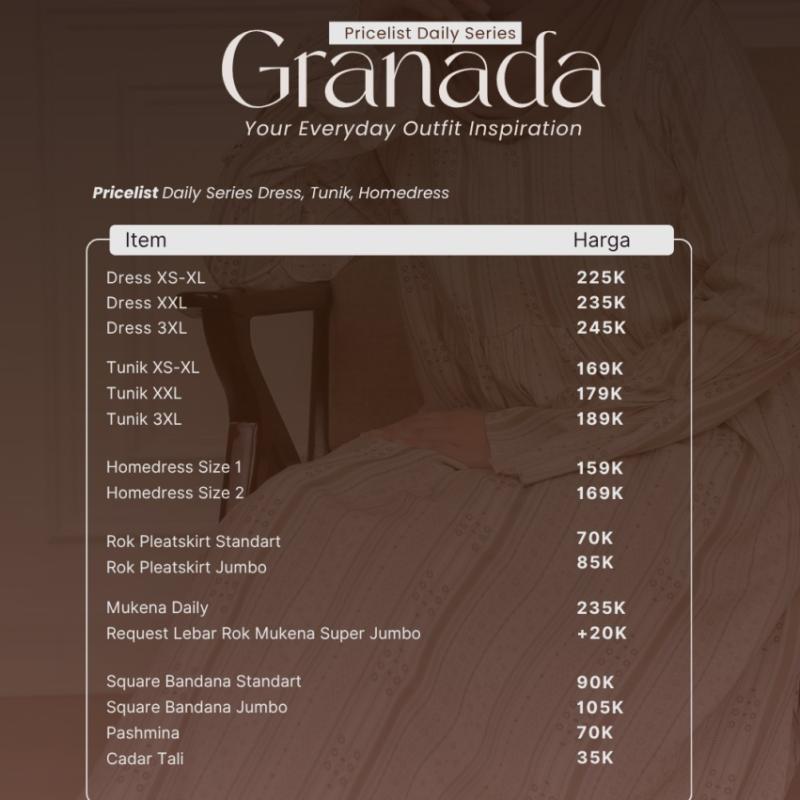 Granada Daily Series by Emkadaily Pilihan Warna : Daily Dress, Tunik, Mukena, Homedress Black | Ocean | ChaiLatte | Oat Square Bandana & Pashmina Black | Denim | Almond | Latte Rok Plisket Black | Charcoal | Latte | Oat Material Premium Rayon Viscose HQ — kain adem, lembut, dan jatuh indah Detail Produk GRANADA DAILY DRESS -Abaya Ploi kanan kiri -Rempel bagian pundak -Saku kanan untuk kemudahan aktivitas -Wudhu Friendly (manset kancing) -Lengan manset & kancing karet -Busui Friendly (sleting dada) -Label akrilik elegan di manset -Lingkar rok lebar, flowy & nyaman -Tali bisa lepas pasang GRANADA TUNIK -Full material Rayon Viscose HQ berkualitas tinggi -Manset ploi dengan kancing cantik -Saku kanan -Sleting depan praktis -Belahan bagian kanan kiri -Lingkar rok lebar yang nyaman untuk bergerak GRANADA MUKENA -Material full Rayon Viscose -Sleting bagian depan -Tali bagian kepala bisa di sesuailan -Rok mukena pinggang karet -Free Tas mukena yang cantik -Nyaman untuk pemakaian harian -All size sampai jumbo GRANADA HOMEDRESS -Full material Rayon Viscose HQ berkualitas tinggi -Lengan rempel cantik -Saku kanan -Sleting depan praktis -Tali serut di pinggang bisa diikat kanan kiri -Tali bagian leher -Lingkar rok lebar yang nyaman untuk bergerak SQUARE BANDANA DAN PASHMINA -Ceruty Babydoll HQ, ringan & jatuh cantik -Bandanapada square bisa di adjust -Ukuran Square bandana: Standar PD 125cm *125cm - Request Jumbo: 145*145cm -Pashmina: 185×75cm ROK PLISKET -Material Hyget HQ, nyaman dipakai Sehari2 -Lingkar pinggang Karet bisa melar -Plisket rapih dan tidak gampang pudar -Pilihan ukuran Standar dan jumbo