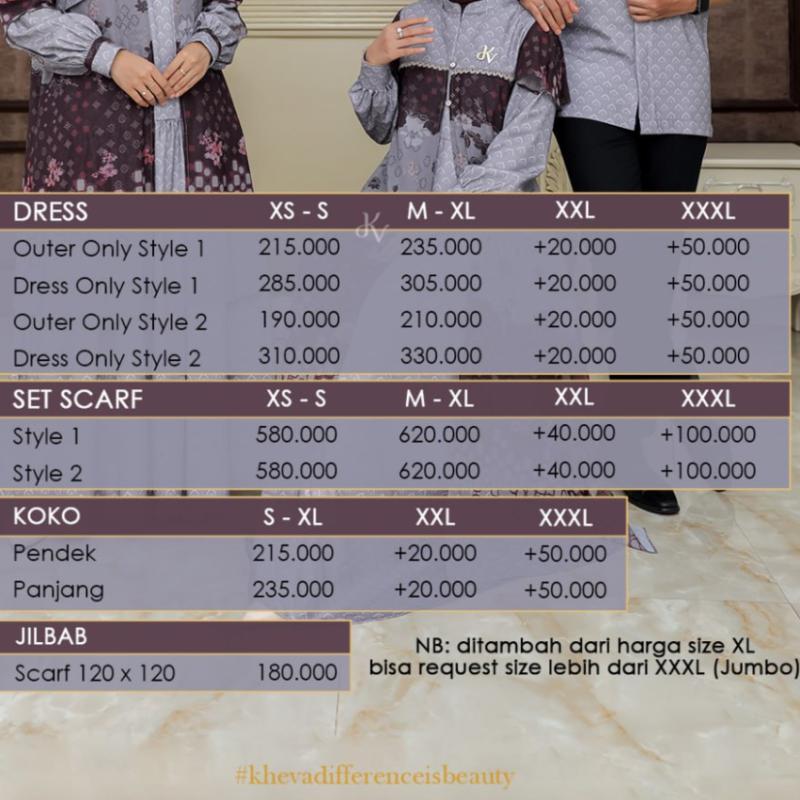 Assalamu'alaikum Kembali hadir karya by @kheva_signature dengan keindahan yang akan membuat setiap momenmu semakin istimewa bersama MAHADEWI SERIES. MAHADEWI terinspirasi dari keagungan dewi, melambangkan kekuatan, keindahan, dan pesona yang tak tertandingi. Bagaikan dewi yang mempesona, semoga kehadiranmu selalu membawa kedamaian dan kebahagiaan bagi sekelilingmu. Dengan Mahadewi, jadikan setiap momen sebagai kesempatan untuk bersinar dan menginspirasi. Wrapped in Faith, Adorned with Beauty Made to Match Your Vibe` MATERIAL MAHADEWI SERIES Torino Printing Exclusive Ciri khas Torino Printing Exclusive memiliki warna yang lebih tajam, handfeelnya lembut, tidak mudah kusut dan tidak menerawang Ceruty Printing Exclusive Memiliki ciri khas handfeel lembut dan ringan, sehingga memberikan efek jatuh ketika dipakai sehingga menciptakan siluet yang menawan. MATERIAL SCARF MAHADEWI Dengan basic material Printing Scarf Exclusive yang memiliki tekstur halus, lembut dan nyaman dipakai. Mahadewi Scarf juga mudah dibentuk dan tidak mudah kusut. Perpaduan warna dan motif yang dikemas dengan sempurna membuat Mahadewi Scarf wajib mewarnai penampilanmu. Mahadewi hadir dengan 2 style dress yang elegan dan menawan DETAIL DRESS MAHADEWI STYLE Material Torino Printing Exclusive Menggunakan kerah shanghai Terdapat belt lepas pasang Resleting di bagian dada (busui friendly) Terdapat manset lengan dilengkapi dengan dua kancing (wudhu friendly) dan aksen renda di ujung manset Terdapat metal tag Kheva di bagian manset tangan Saku di bagian kanan rok Keliling rok ±2,5m Berat dress size M 0,58kg DETAIL OUTER MAHADEWI STYLE 1 Material Ceruty Printing Exclusive mix Torino Printing Exclusive Outer terpisah dengan dress Terdapat cuttingan V neck yang dihiasi dengan renda di bagian dada menambah kesan mewah dan elegan Terdapat dua kancing pengait di bagian depan outer Terdapat lengan ruffle Memiliki cuttingan longgar dan bahan yang ringan sehingga memberikan kesan nyaman saat dipakai size outer mengikuti size dressdan Berat outer size M 0,16 kg DETAIL DRESS MAHADEWI STYLE 2 Material Torino Printing Exclusive mix Ceruty Printing Exclusive Outer terpisah dengan dress Menggunakan kerah shanghai Resleting di bagian dada (busui friendly) Dress dengan potongan ruffle di bagian rok yang menambah kesan manis Terdapat tali lepas pasang Terdapat layer variasi di bagian lengan menambah kesan elegan dan mewah Manset tangan dihiasi lis Ceruty Printing Exclusive dan dilengkapi dengan 1 kancing (wudhu friendly) Terdapat metal tag Kheva di bagian manset tangan Saku di bagian kanan rok Keliling rok ±2,5m Berat dress size M 0,70 kg DETAIL OUTER MAHADEWI STYLE 2 Material Ceruty Printing Exclusive Outer terpisah dengan dress Terdapat kancing pengait di bagian depan outer Terdapat kombinasi layer tumpuk pada bagian depan dan belakang outer Memiliki cuttingan longgar dan bahan yang ringan sehingga memberikan kesan nyaman saat dipakai size outer mengikuti size dress Berat outer size M 0,16 kg DETAIL SCARF Material Printing Scarf Exclusive Menggunakan cutting laser Tersedia Ukuran 120 cm x 120 cm Tersedia scarf Only Berat scarf 0.08 kg Disarankan untuk mencuci scarf terlebih dahulu sebelum pemakaian demi kenyamanan saat dikenakan dan handfeel yang lebih lembut serta halus DETAIL KOKO Material Torino Printing Exclusive Menggunakan kerah kemeja Terdapat kancing terbuka di bagian atas dan kancing tertutup Terdapat saku atas di bagian dada kiri Bisa order lengan pendek maupun lengan panjang berkancing Berat Koko pendek size M 0,28 kg dan Koko lengan panjang size M 0,34 kg Mahadewi Series hadir dengan 5 varian warna yang membuatmu tampil lebih indah dan serasi Mauve Plum Deep White Charcoal Grey Blue Depth Earth Brown