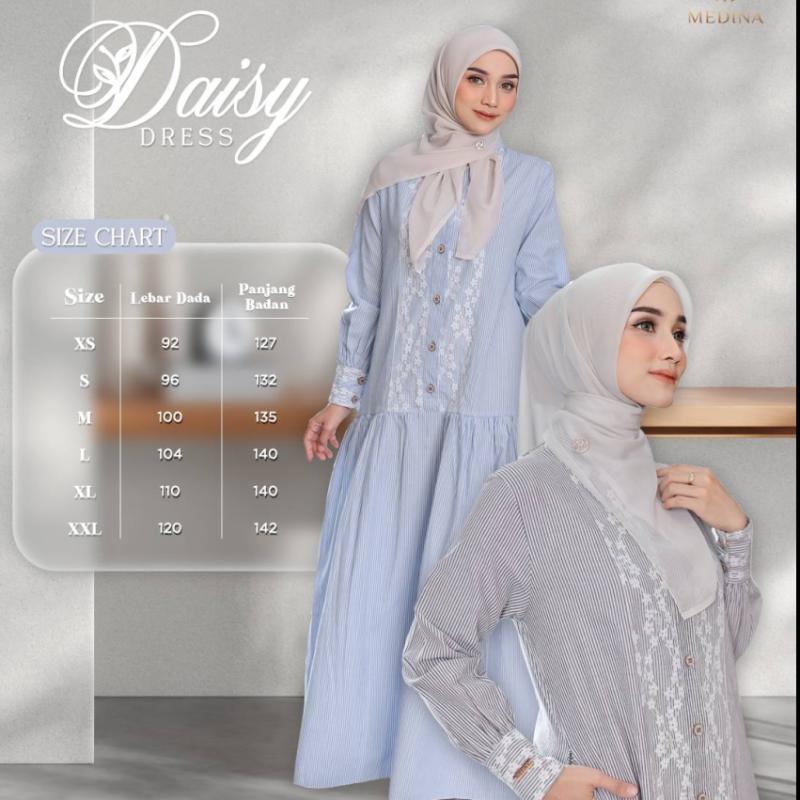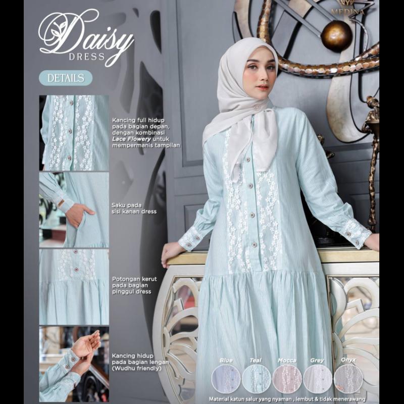 Bismillahirrahmanirrahim PO Daisy Dress by MEDINA @medinaofficial.idn Definisi effortlessly stylish. Nyaman, adem.. auto glow up! Perpaduan motif stripe dengan lace bunga bikin look kamu semakin cantik Spesifikasi -Material cotton stripe, berkatakteristik lembut, ringan, dingin dan tidak menerawang -Variasi lace flowery yang mempercantik tampilan dress -Kancing disisi depan dress -Manset kancing pada tangan(wudhu friendly) -Rok mode bertingkat untuk look dress yang makin elegant -Pilihan warna yang soft & manis Pilihan Warna 1.BLUE 2.GREY 3.MOCCA 4.ONYX 5.TEAL Size Chart & Harga -Terdapat pada flyer Disclaimer *Toleransi 2-3cm karna proses produksi massal *Noda-noda kapur/karena proses produksi yg bisa hilang tidak termasuk riject *Perbedaan warna 10-20% karena efek lighting photoshoot & perbedaan layar gadget. Warna asli cenderung lebih gelap. Wajib DP 50rb/pcs jika tidak maka orderan tidak di proses PO no cancel #DaisyDressbyMedina #DaisyDress