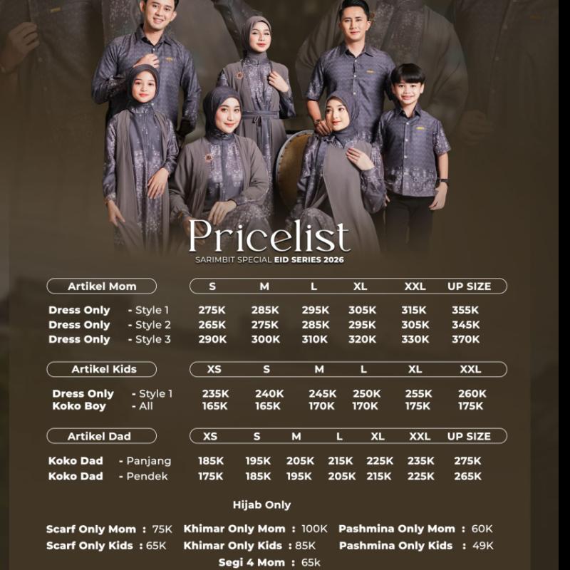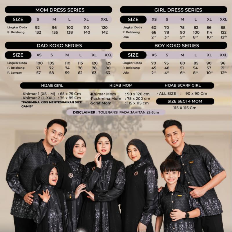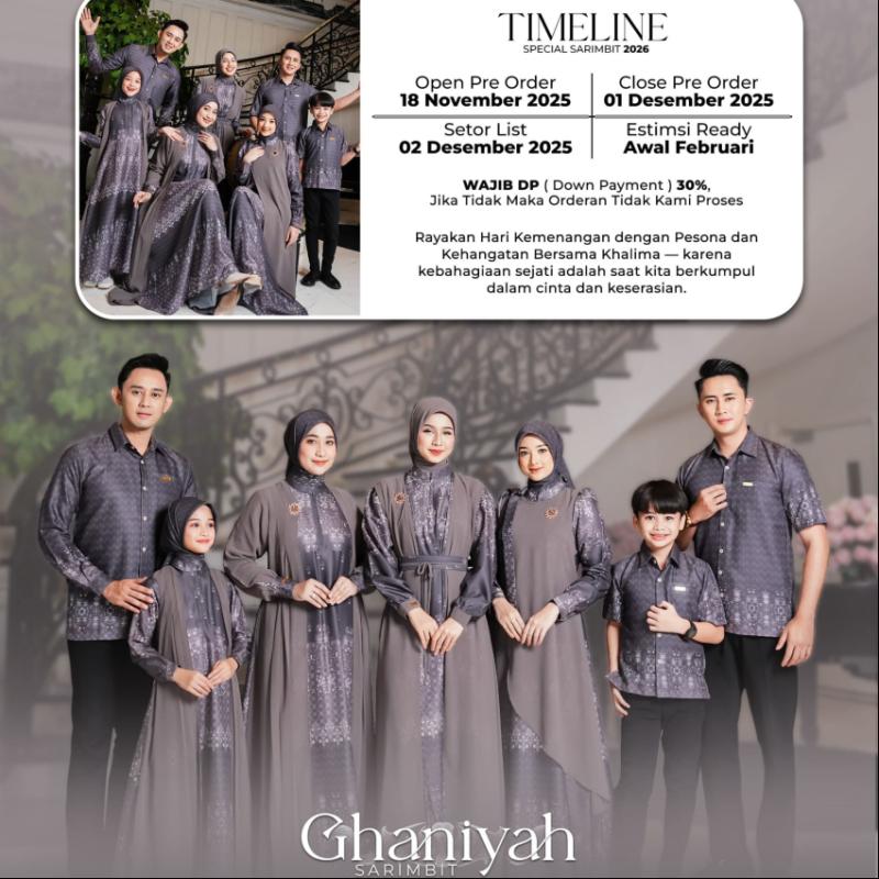 Assalamualaikum.. Proudly present By @Khalimaofficial Launching Today SARIMBIT GHANIYAH Hari Raya adalah momen paling dinantikan setiap tahun. Saat seluruh keluarga berkumpul, melebur dalam tawa, doa, dan rasa syukur. Di tengah kebersamaan itu, setiap detail menjadi berharga — mulai dari hidangan yang tersaji, cerita yang dibagikan, hingga penampilan yang memancarkan kebahagiaan sejati. Khalima menghadirkan koleksi Sarimbit Lebaran Terbaru, Desain yang istimewa nan mewah, dengan mengutamakan kenyamanan. Merayakan Hari Kemenangan dengan Pesona dan Kehangatan Bersama Khalima — karena kebahagiaan sejati adalah saat kita berkumpul dalam cinta dan keserasian. MATERIAL PRODUK: ??? Bahan -- Alora Twill Premium ~ Bahan dengan kualitas premium yang mewah saat dipakai. salah satu Kategori Twill yang berserat diagonal. Bahan ringan, flowy, adem dan menyerap keringat dengan baik. Jenis kain ini tidak menerawang. Printing ekslusif -- perpaduan motif kombinasi, antara motif geometris yang membentuk seperti jaring - jaring, dipadukan dengan pola floral yang menambah kesan feminim yang mewah, serta pola garis horizontal dan pola bordir yang memisahkan bagian bagian motif, memberikan kesan seperti bordiran atau hiasan.. DETAIL KHIMAR Material khimar sama dengan outer yaitu Ceruti Baby doll bertekstur seperti kulit jeruk yang halus, dengan permukaan bintik-bintik kecil, terasa lembut dan jatuh saat dikenakan, serta tidak mudah kusut dan lentur agar pengguna tetap merasa nyaman meski seharian beraktivitas Khimar double layer Khimar Soft pad antem dengan jahitan super rapi Khimar berbentuk V Terdapat akrilik brand dibagian depan khimar Size khimar mom 90×120 cm DETAIL SCARF Scarf Voal premium (lembut & tegak ketika dipakai) Motif scarf perpaduan motif floral dengan motif kecil berulang sehingga memberikan sentuhan modern dan anggun Dengan details tepi lasercut Ukuran Scraf (115 × 115 cm) SPESIFIKASI DRESS MOM STYLE 1 Menggunakan kerah shanghai Busui friendly - resleting depan tersembunyi dengan detail hidden placket Terdapat 2 aksen lipit kanan kiri dari bahu hingga bagian dada Desain outer yang dijahit menyatu dengan badan gamis Lengan gamis menggunakan bishop sleeve yang memberikan kesan anggun dan feminim Bagian lengan menggunakan Alora Twill yang di balut dengan bahan Ceruti babydoll yang dipercantik dengan list motif yang sama dengan dress, sehingga menambah kesan yang menawan Wudhu Friendly - Didesain dengan lengan manset lurus (straight cuff) dengan kerut pada sambungan lengan yang bermotif geometris jaring jaring floral dan dilengkapi dengan 2 kancing brand serta terdapat akrilik brand Terdapat saku dibagian kanan gamis SPESIFIKASI DRESS MOM STYLE 2 Didesain dengan outer asimetris menyatu — dijahit permanen pada bahu, mengikuti garis potong princess line di sisi kanan dan kiri,tanpa sambungan ke bagian belakang Material outer ceruty premium - didesain layer asimetris dengan potongan depan menumpuk elegant - menutupi dada hingga mendekati lutut bagian depan untuk tampilan yang sopan dan elegan. Potongan bawah layer didesain asimetris dengan bentuk melengkung lembut (U-shape soft curve), menciptakan siluet jatuh yang manis dan feminin Dihiasi dua kancing brand di bahu kanan, berfungsi sebagai detail pemanis sekaligus pengait layer. Dilengkapi 2 tali, 1 tali dibagian bahu kanan, dan satu tali dijahit menyatu dengan layer ceruti yang bisa dibentuk pita, memberikan sentuhan feminin dan bisa disesuaikan gaya ikatnya. Menggunakan kerah shanghai yang rapi dan berkarakter. Busui friendly – resleting depan tersembunyi dengan detail hidden placket. Dilengkapi puff sleeve pada bagian bahu untuk kesan lembut dan feminin. Lengan bermanset lurus (straight cuff) dengan 2 kancing aktif yang wudhu friendly, serta plat brand eksklusif di manset. Terdapat saku fungsional di sisi kanan gamis untuk kenyamanan aktivitas sehari-hari.